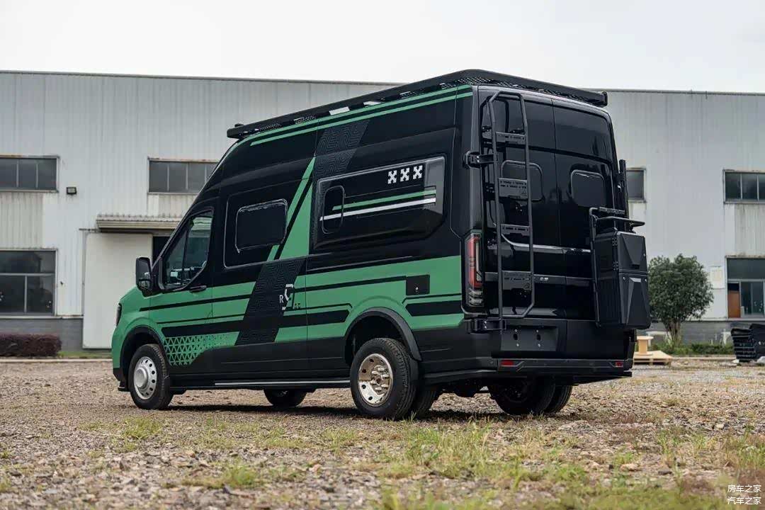 瑞弗启界R900的车身色彩和拉花是可以选配的,除了白色和蓝色撞色的外观以外,还可以选择绿色和黑色撞色的车型,车外可以选配车顶行李架、车尾后爬梯、户外灶具等等设备。