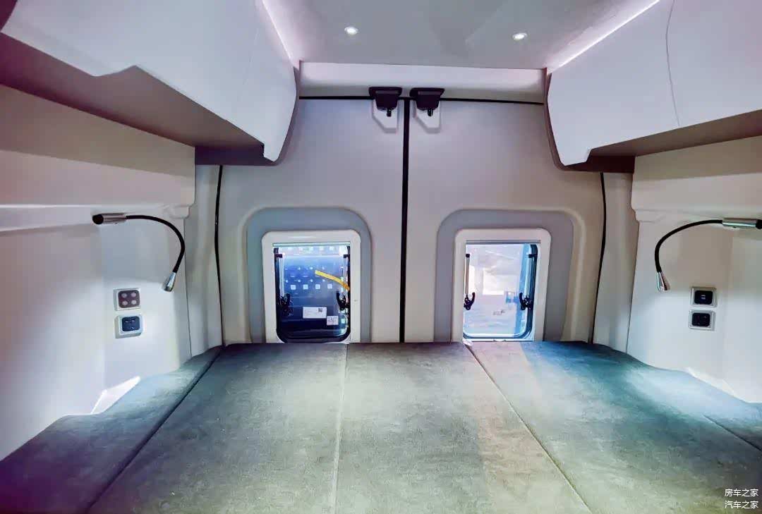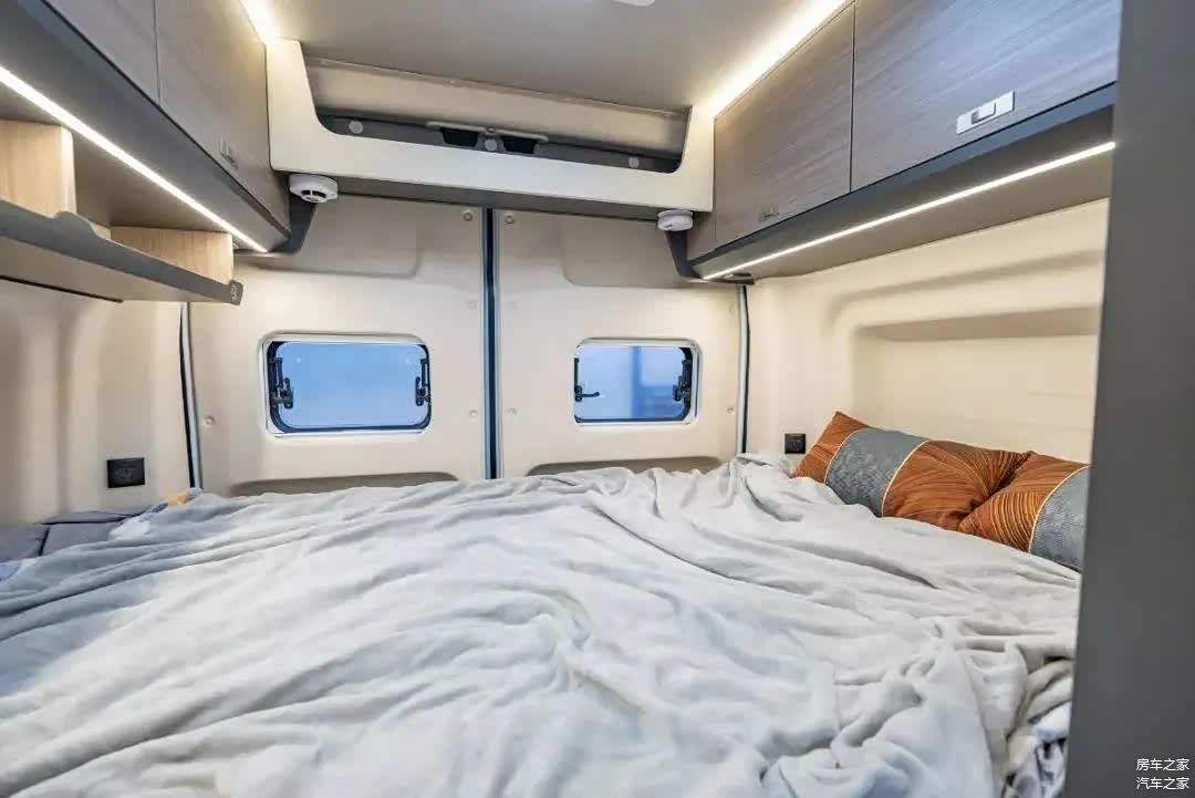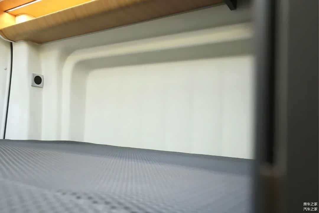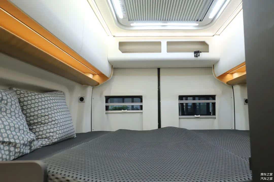 后床区域设计非常规整,首先全车内部箱体的吸塑开模本身就不常见,搭配这种类似飞机航空舱吊柜门的形状,看起来异常舒服。我们在车外看到的两侧盲窗外拓的设计在车内的横床区域有了比较明显的表现,它的后床位尺寸达到了2000×1300(mm),配备了一款叫做4D的空气纤维床垫,舒适性提升明显。
