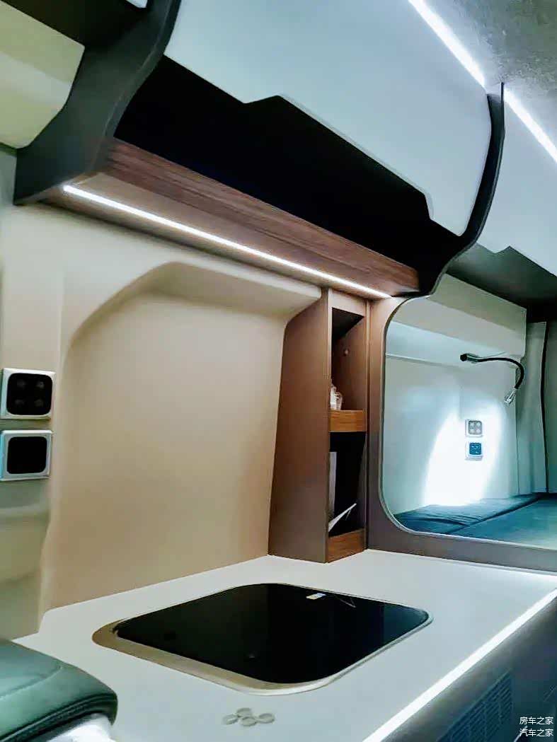 车内的氛围感仍然是熟悉的味道,整车可以设定3-6人的座椅布局,我们看到的是5座的布局,车尾是一款横置双人床,中部是卫生间和厨房区。不同以往启界R系列产品的是,这次的会客区餐桌由固定式改为可折叠隐藏的延伸桌板。这次的厨房也小有创新,侧方采用了电磁炉独立安装在抽拉板上的设计,给操作台预留了更多空间。
