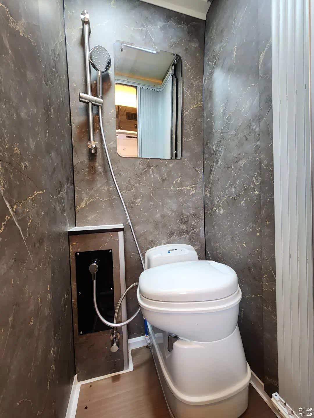 车厢中部是紧凑的厨房和卫生间区域,厨房操作台只有一款带玻璃盖板的洗菜池,车内做饭的需求不妨可以借助于车外来完成,车内烧水煮面应急使用。厨台下方是一款95升抽屉式冰箱,满足出行中的菜蔬储备。这款车的配置同样不低,10度电的电池,400W太阳能板,3500W逆变器,全车48V电路系统,双行车发电机,空调、暖风设备一应俱全,指导价53.8万元。