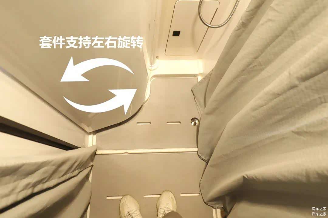 “借位”形式的推拉卫生间,固定之后,内部的空间也还是可以的。尾部的卧室区域配有横置大床铺,尺寸可以达到2050m×1300(mm)。整体来看这款车的细节优化和质感比起之前的R系列要更好一些。