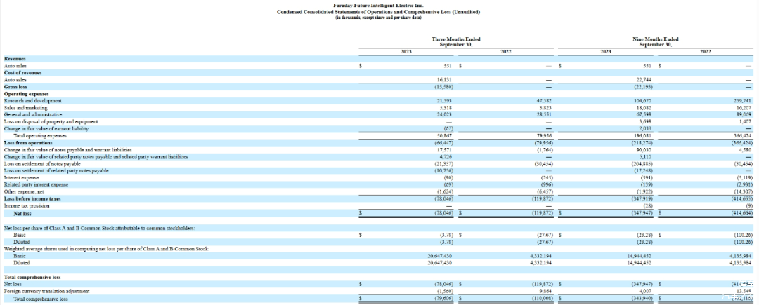 近日,法拉第未来公布了2023年第三季度财报。