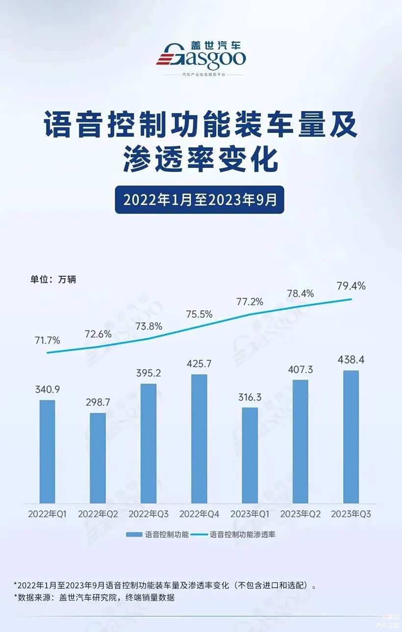 据盖世汽车座舱配置数据库统计,2022年1月至2023年9月,汽车的语音控制功能装车量从340.9万辆增长至438.4万辆,渗透率也从71.7%提升至79.4%。这一现象反映出,随着消费电子产业的繁荣发展和终端市场消费的持续升级,用户对智能化体验的需求逐渐延伸到汽车座舱领域。