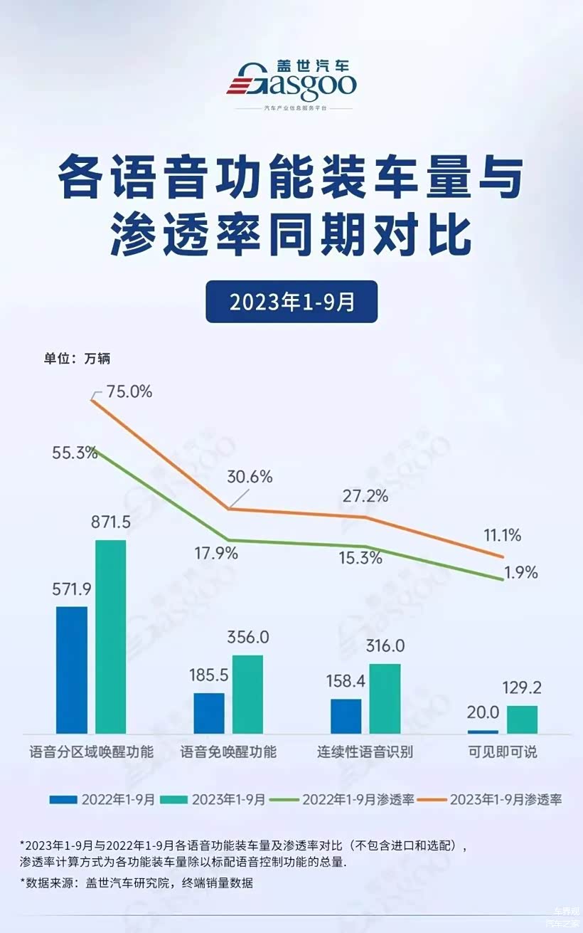 据统计,2023年1月至9月,语音分区域唤醒功能的装车量为871.5万辆,同比增长了52.39%,渗透率从去年同期的55.3%上升至75.0%。此外,语音免唤醒功能、连续性语音识别以及可见即可说等功能的装车量也有明显上涨。