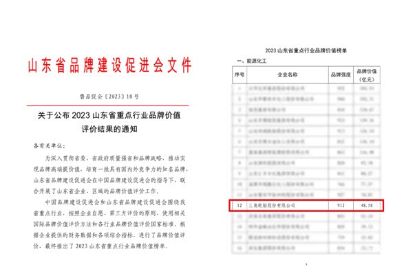 12月5日,山东省品牌建设促进会召开“2023年度山东品牌年会”,会上发布2023山东省重点行业品牌价值榜单。三角轮胎以品牌强度912,品牌价值48.58亿元位列能源化工榜单第十二位。