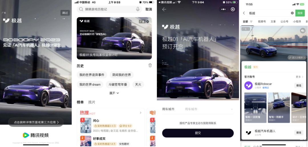 再比如在极越新品发布时,极越与腾讯的合作,联合腾讯广告图谱识别能力以及自身一方人群数据,构建极越01专属人群模型。同时还联动包括腾讯视频-搜索品牌卡等在内的多元留资组件,提高目标客群的留资效率。同时,从0到1构建品牌达人带货体系,邀请达人短视频内容加速种草、引导用户线下门店试驾,此后再通过下订权益政策,吸引用户留资、下转化。