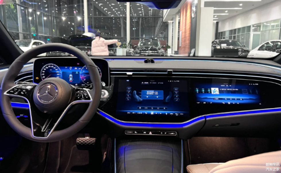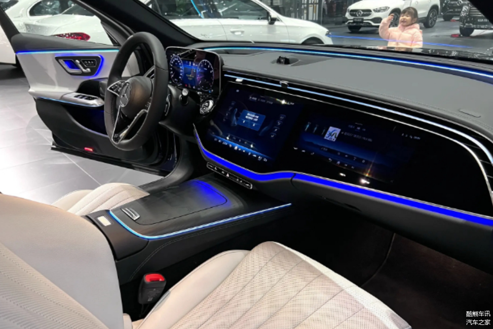 全新长轴距E级轿车的内饰设计借鉴自奔驰EQS,采用了被称为“MBUX超级屏”的三屏中控台布局,其中控台表面由整体触控面板构成。同时,新车可选经典和运动两种主题,可伴随车内氛围灯颜色和液晶仪表盘显示风格等同步调整。全新长轴距E级车还配备有多种高科技配置,如360度环绕式环境氛围灯、“随音悦动”以及Burmester 4D环绕立体声音响系统等,为乘客带来更加舒适和智能化的驾乘体验。
