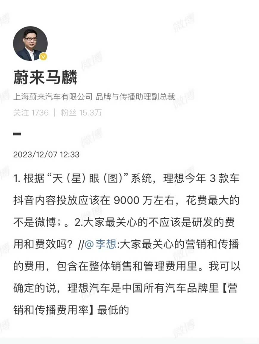 那对于友商的反思呢,斌哥打的是含泪独自承受委屈的“苦情牌”。就在上周,理想汽车的创始人李想转发了一条博文,博文内容内涵蔚来、小鹏营销费用占比高,同时李厂长还表示理想汽车的营销费用全国车企最低。对于这事,蔚来品牌与传播助理副总裁马麟就不同意了,转发理想微博回怼,表示理想今年在抖音内容投放费用在9000万左右,还“建议”理想应该关注研发费用和费效。
