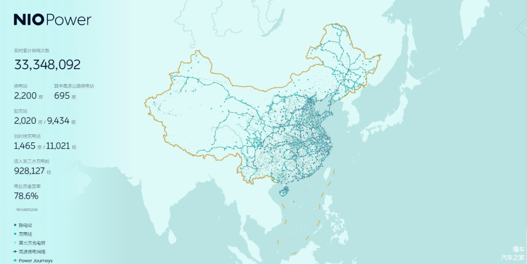 简单说几个数据:截至2023年12月6日,蔚来已经在国内建设了2,200座换电站(是的,蔚来还在海外建设换电站)、2,020座充电站,共计9,434根充电桩;
