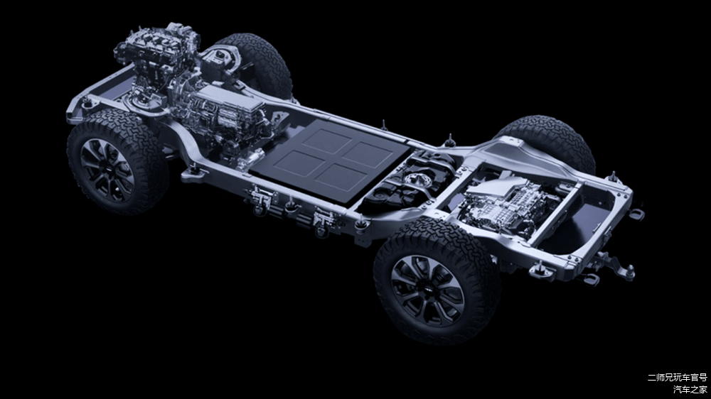 配智能电四驱+三把锁,采用的是带大梁的非承载式车身结构。