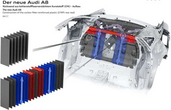 如今,奥迪A8上依旧拥有该公司在ASF概念车上的研发成果:铝与镁、钢和碳纤维增强塑料 (CFRP) 相结合。比如奥迪A8后车身舱壁采用的是CFRP材料,超高强度、扭转刚性极强的后板是全新奥迪A8乘员舱中体积最大的组件,它占整车总扭转刚度的33%。