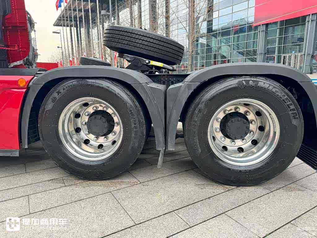 在底盘附件上同样能体现出解放J7创领牵引车的高端定位,像全车的轮毂轮胎均为米其林X LINE低滚阻轮胎+轻量化铝合金轮毂的组合。全车的轮端也都是采用的康迈油润滑轮端,带有可视观察窗设计,油液在未缺少未变质的情况下无需更换。