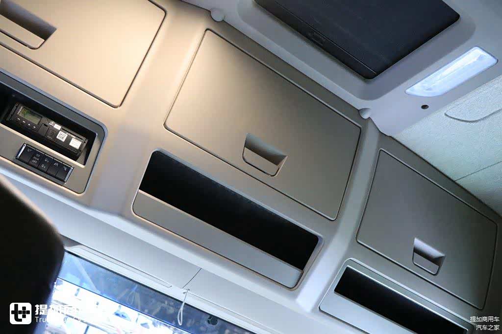 车顶位置设置三处储物柜和两个开放式储物槽,对于卡友们的日常储物需求是完全能满足的,如果不够,卧铺下面还有两个大型储物柜可供使用。