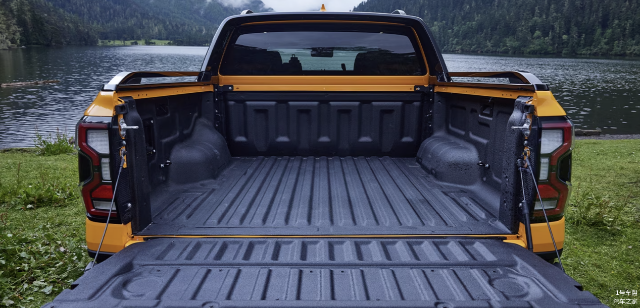 车尾部分的重点是其功能性拉满的货箱,一是空间大,可容纳欧标1200x800mm尺寸的标准叉车盘;二是耐磨,原厂便喷涂了“货箱宝”;三是装卸方便,尾门支持缓降和助力功能,货箱内还预设了多达36个改装锚点和4个可调节的绳钩卡扣;此外诸如后斗照明、侧踏板和400W的后斗电源等,确实是美国家庭人手一部的最强“工具车”没错了。