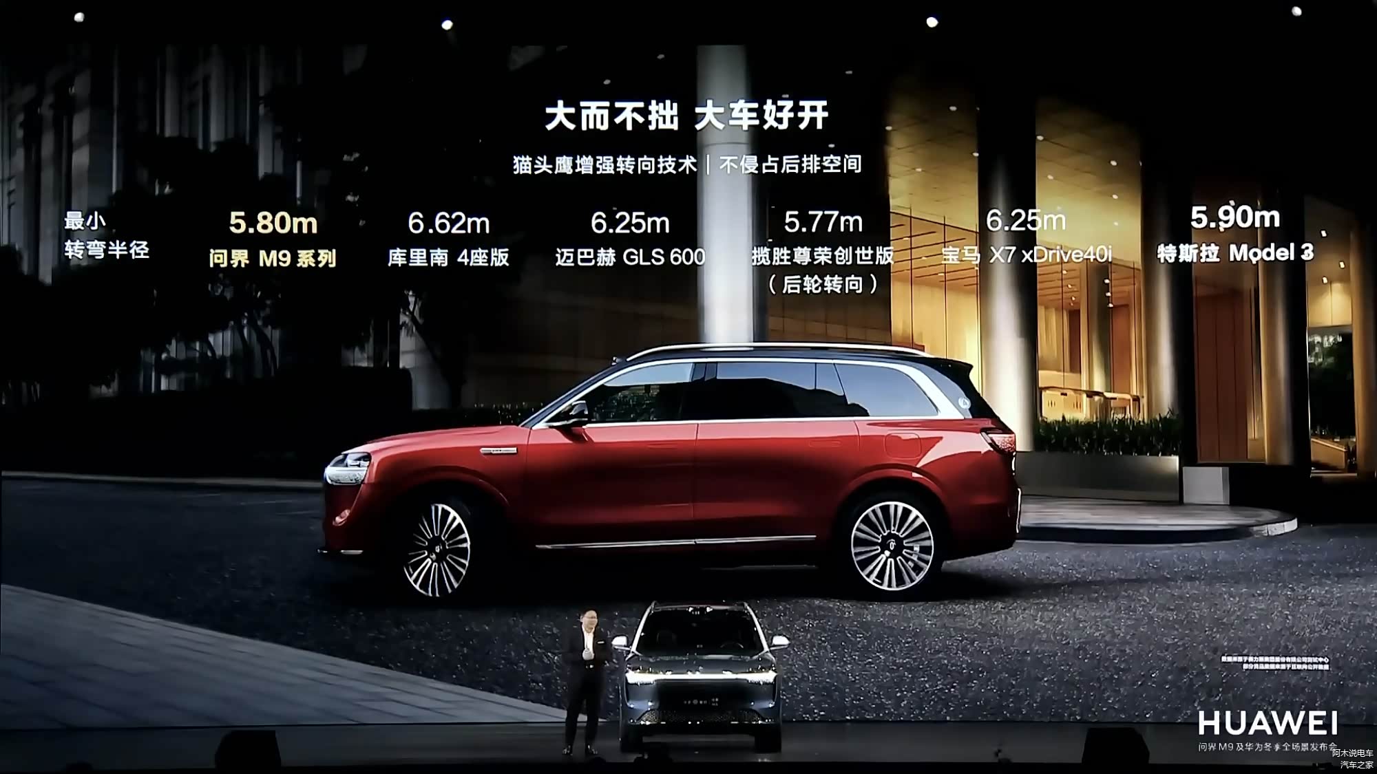 问界M9车辆的最小转弯半径达到了5.8米,没有搭载后轮主动转向功能,而是采用官称为猫头鹰增强转向技术。