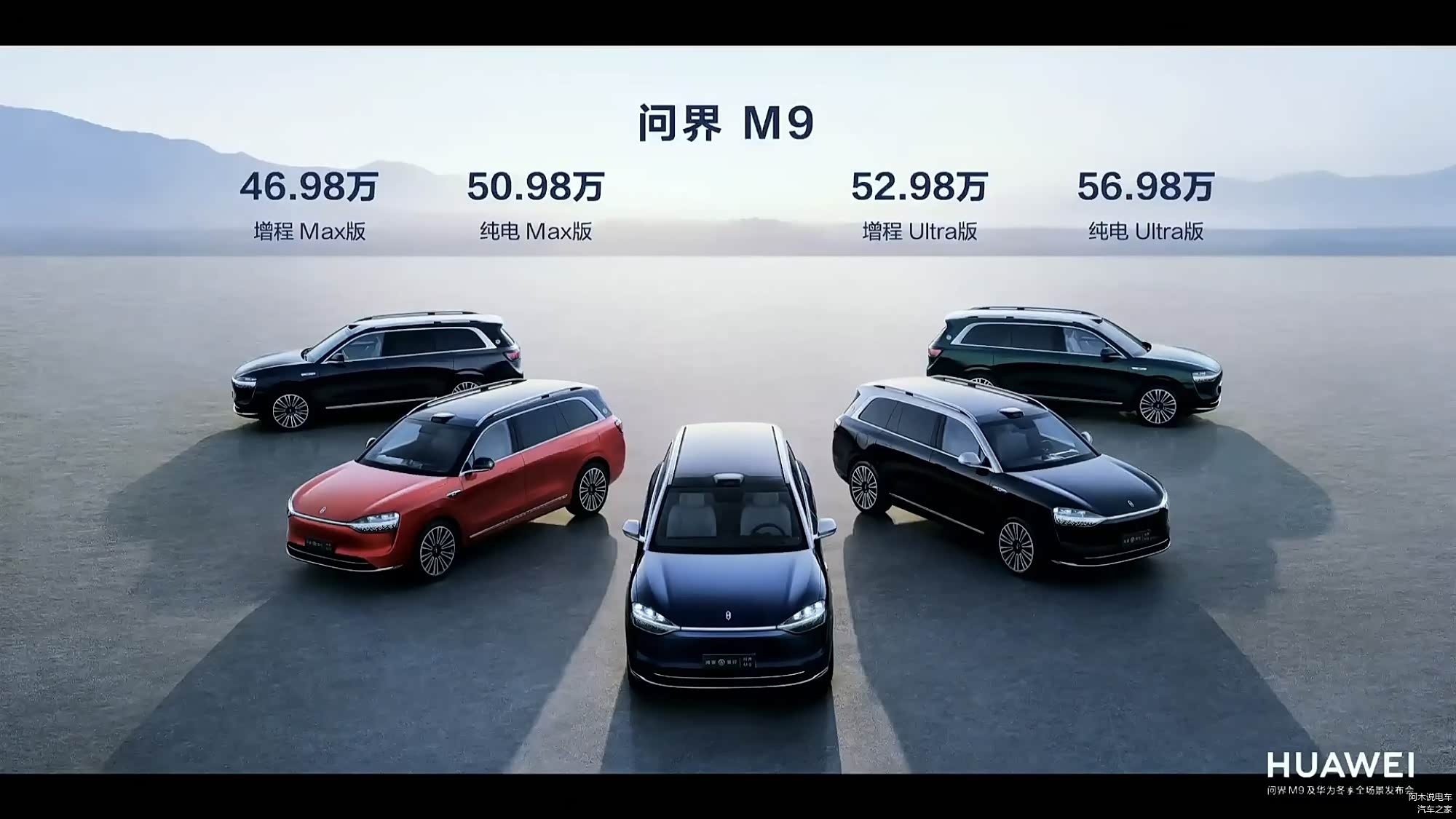 在今天的华为发布会上, 问界M9(图片 | 参数 | 询价)迎来了正式上市。一共发布了4款车型,分别为两款纯电车型以及两款增程车型,纯电车型价格为50.98万元Max版与56.98万元Ultra版,增程车型价格为46.98万元的Max版与52.98万元的Ultra版两款。新车是华为与赛力斯联合打造的全新旗舰车型,定位是一辆大型新能源SUV。