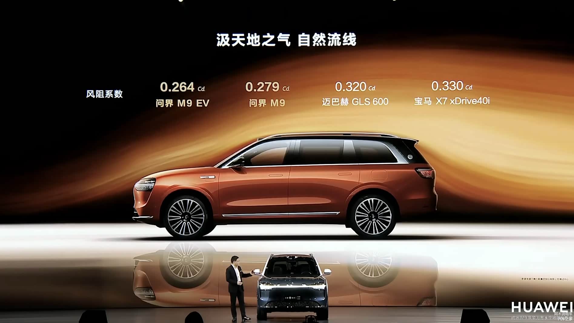 车身侧面,提供了双拼颜色选择。采用了隐藏式门把手设计。作为一款新能源车,纯电版本问界M9的风阻系数为0.264cd,增程版本的问界M9的风阻系数为0.279cd。