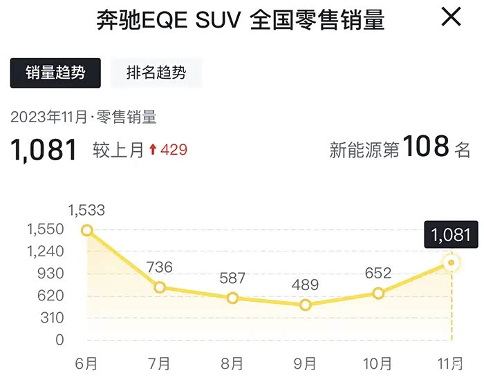另外奔驰EQE SUV也是这样的销量走势逻辑,该车在今年5月27日正式完成上市,经历6月份首个完整月的销量为1533辆,到了7、8、9、10月的销量又维持到了每月几百台水平,而从10月份往后开始终端优惠释放后,奔驰EQE SUV的销量单月又直接干到了1081辆。
