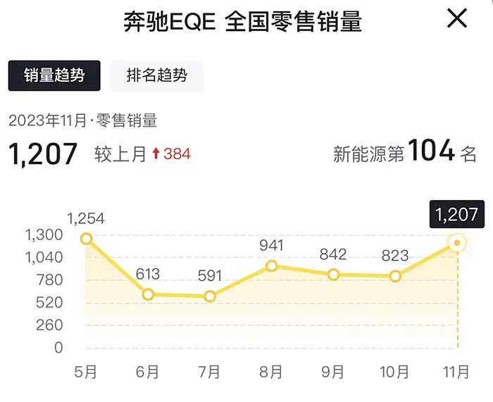 而奔驰EVA纯电动平台下的奔驰EQE以及EQE SUV产品,是奔驰真正意义上的纯电动车型,但可能是定价太高的缘故,两款车型在前几个月的表现实在是一般,先拿奔驰EQE来说吧,根据销量排行榜显示的数据,今年以来现款奔驰EQE除了5月份拿到了1254辆破千的销量,其余9个月份里每月月销才几百台,但考虑到该车从10月份终端优惠开始逐步释放,所以11月份便取得了1207辆。