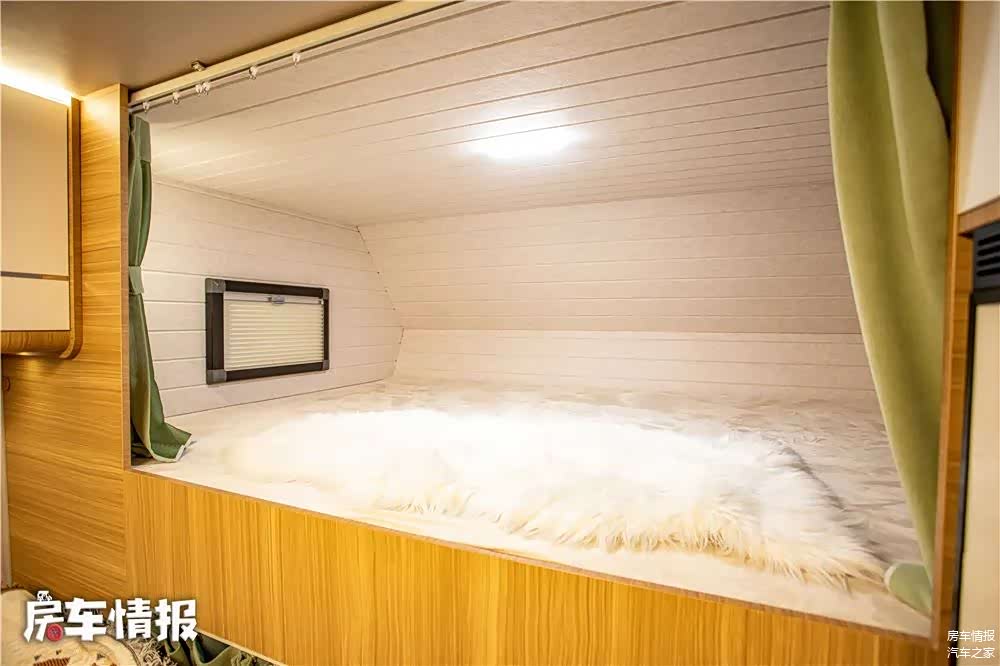 第二张床是驾驶室上方的额头床,尺寸为2100毫米*1400毫米,尺寸比较宽大,可以轻松睡下两名成年人,并且得益于平直的车顶造型,内高达到了60公分,无论睡在内侧还是外侧,都不会感到憋屈,如果还是不满意,高配车型的额头顶部还可以向上升起,进一步扩大空间。