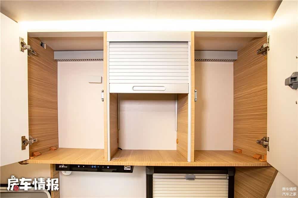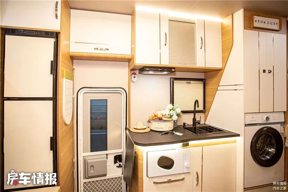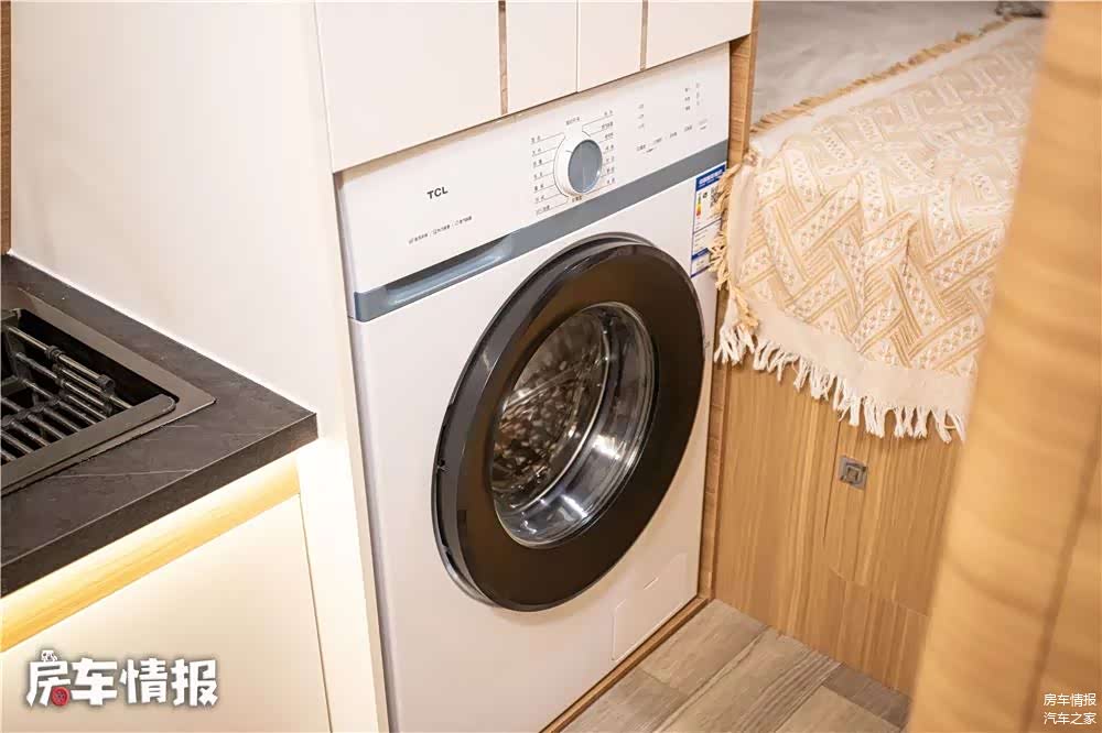 厨房后方的空间也得到了有效利用,上方是一个空间挺大的储物柜,衣服、被褥都可以存进去,下方是一台洗衣机,便于在旅行中清洗衣物。