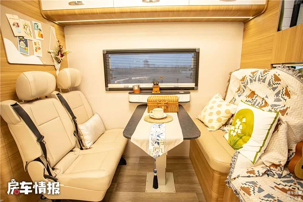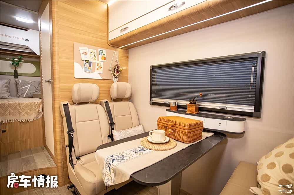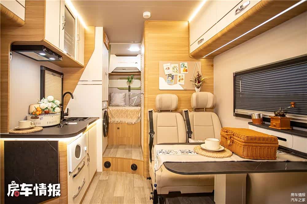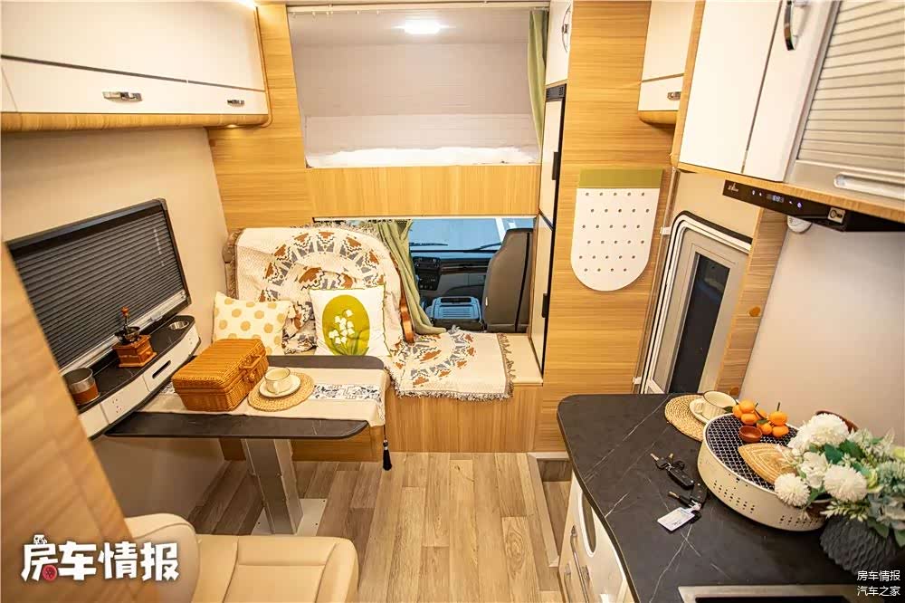生活区的整体设计,我个人还是比较喜欢的,浅色家具搭配这种木纹饰板,让整个生活区看起来比较清新舒适,另外内部垂直高度也比较充足,达到了2.1米,就算是1米9的大个站在这里也不会碰头,另外家具细节的处理也挺出色,真的很难相信,这款车的价格只要20多万!比起之前见到过的同价位车型,真的优秀太多~