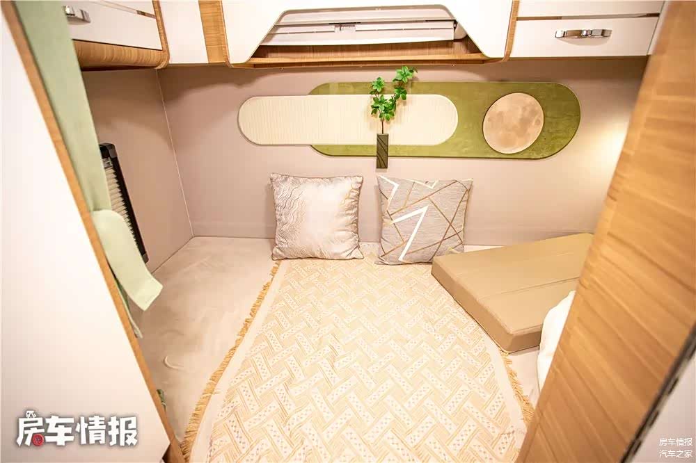 除了前边的沙发床以外,车内还提供了两张固定床,第一张是尾部的横置双人床,尺寸约为2200毫米*1220毫米,睡下两名体型偏瘦的成年人没问题;尾床的内侧也提供了充电接口以及储物吊柜,日常给手机充电、存放个人物品都比骄傲顺手。