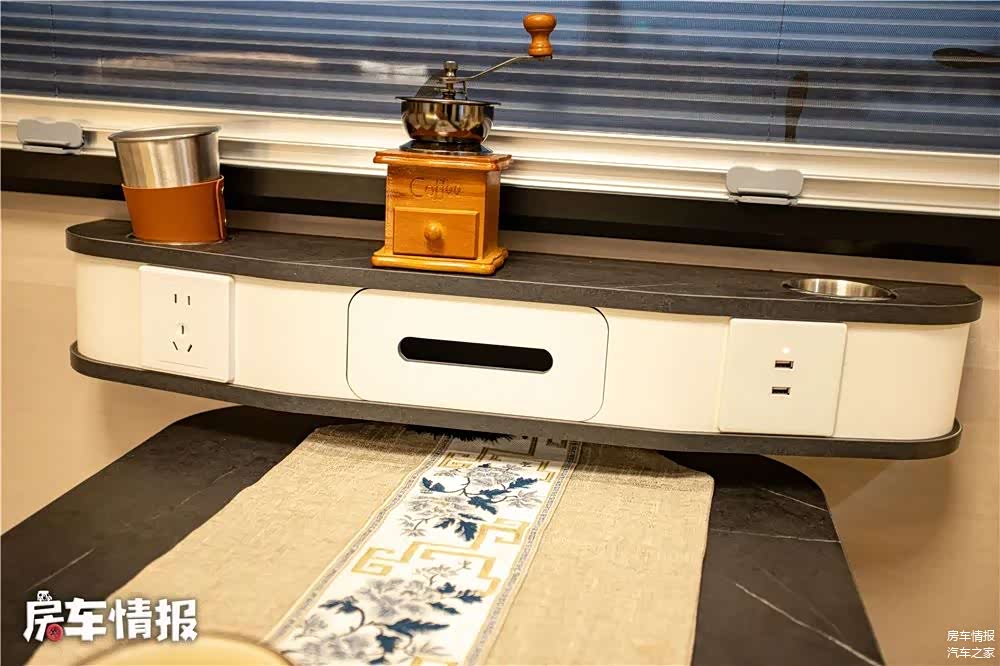 卡座内侧集成了杯托、USB充电、五孔电源插座以及磁吸式纸巾盒,提升了日常使用的便利性。