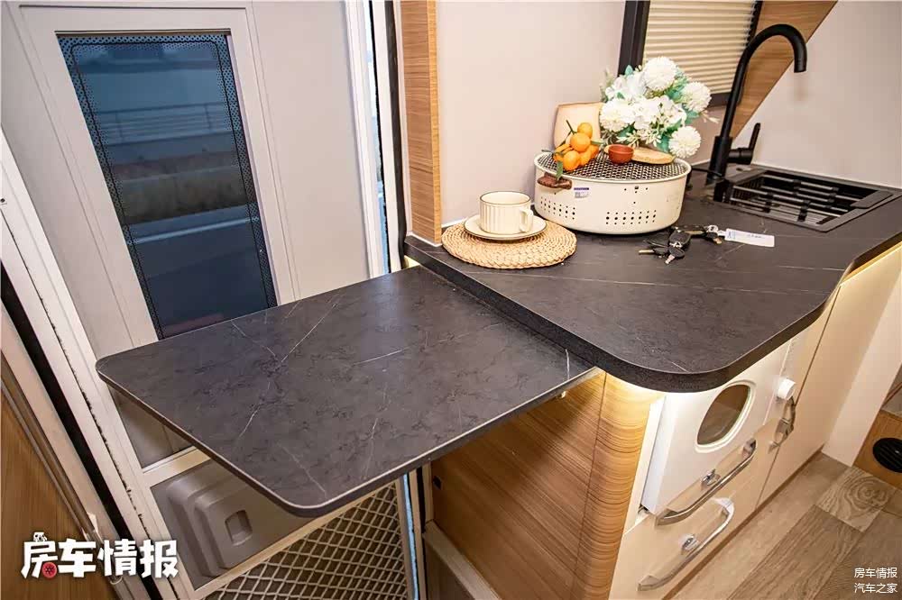 房车内部的厨房区域,位于中门后方,145升房车专用冰箱被设置在前方,后方则提供了 整体厨台,提供了抽油烟机、洗菜池、微波炉等设备,如果觉得操作台尺寸不够大,外侧也有拓展板,打开以后可以摆放更多的厨具。