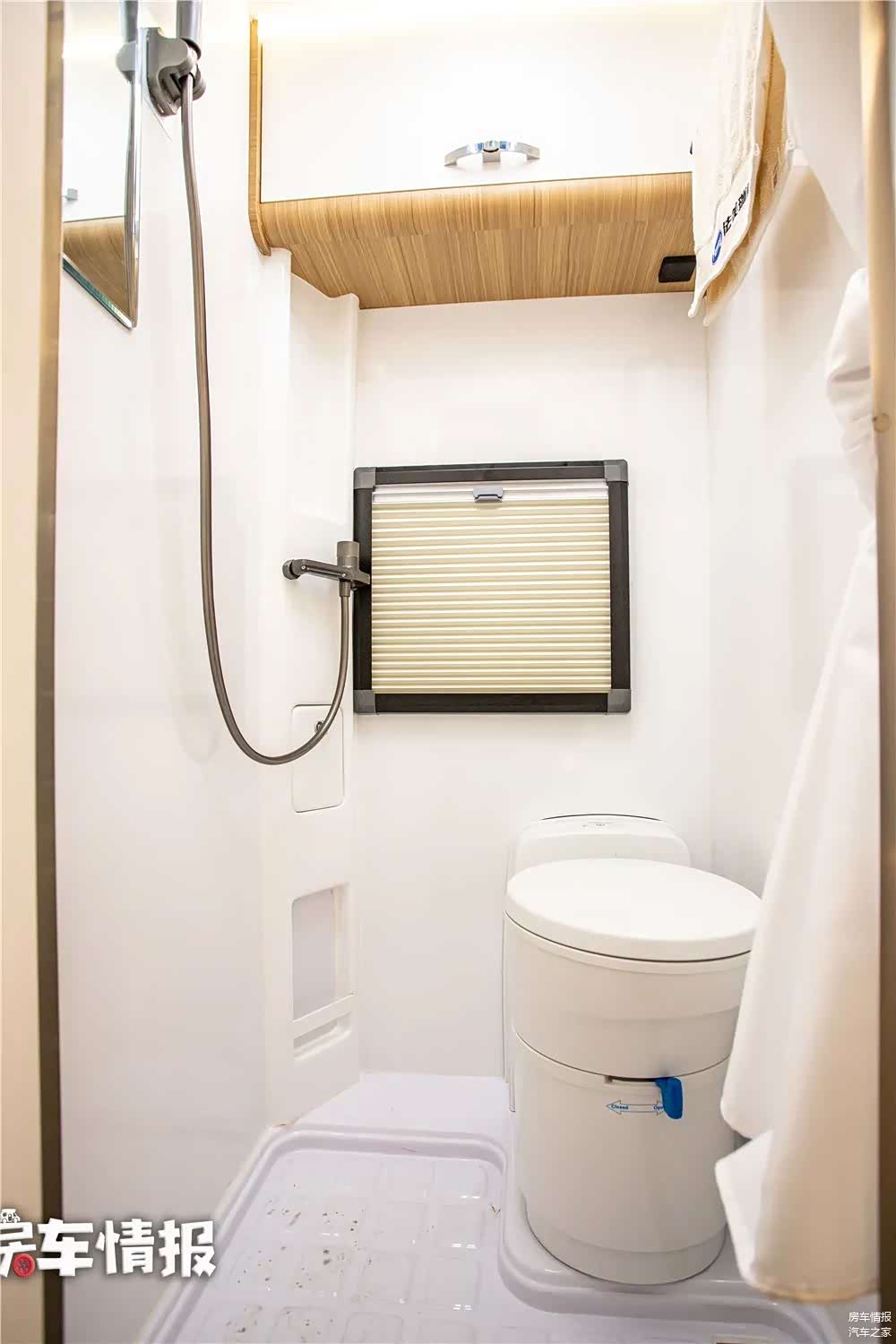 卫生间的位置同样位于车厢中部,内部空间也挺不错,一个人成年人在内部可以自由活动,基础设备也比较齐全,花洒、盒式马桶、换气扇等都有配备,另外这款车还提供了320升清水箱(含50升循环热水箱)、100升灰水箱,日常洗漱基本上不用担心。