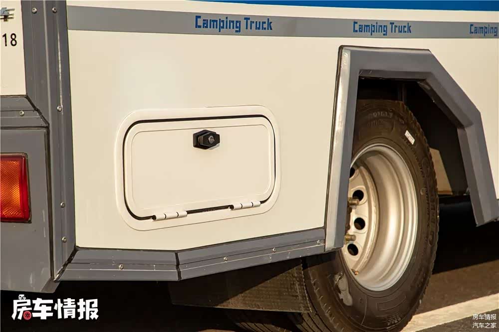 来到车身侧面,就是一些比较常规的户外设备了, 下方提供了外置柴油灶、上方有手动遮阳棚、尾部贯通式储物舱,基本上能够满足日常使用。