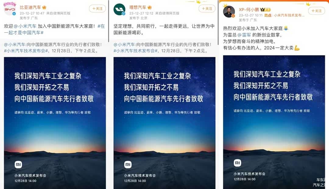 此外,小米也十分尊重在造车新百年中作出贡献的“友商们”,在小米汽车技术发布会的前一天,雷军个人、小米汽车官方都分别发文向中国新能源汽车先行者致敬。除了图片中提到了“比亚迪、蔚来、小鹏、理想、华为”外,在雷军的个人微博中还额外提到了宁德时代。对此,比亚迪汽车、理想汽车官微,何小鹏本人微博纷纷回应支持小米汽车。在27日晚间,小米也分别在前述五家“先行者”的总部所在城市地标买下外景LED屏幕展示位,向他们表示致敬。蔚来汽车李斌也亲自发文表示祝贺。