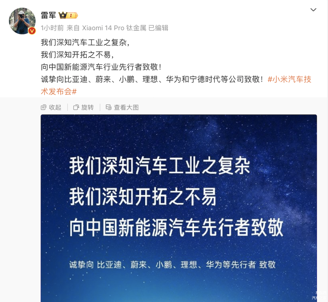 自从本周一小米汽车技术发布会定档后,雷军便屡发微博为小米汽车造势。