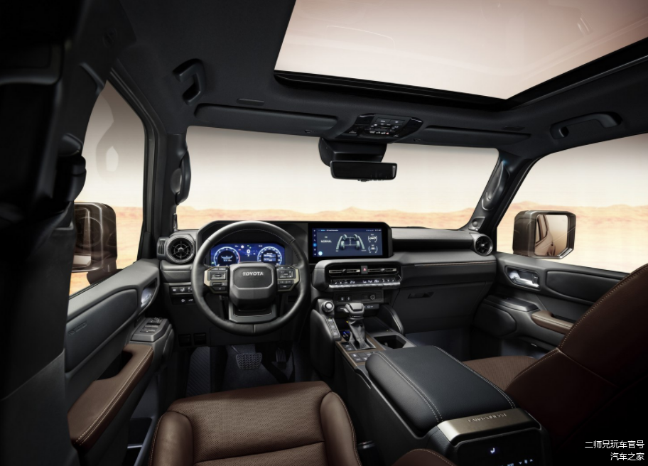 内饰部分,全新 普拉多(图片 | 参数 | 询价)采用了更现代化更科技的设计,配备了12.3英寸的中控显示屏+全液晶仪表,还提供多地形监视器、三分区空调、14扬声器JBL音响系统等配置。