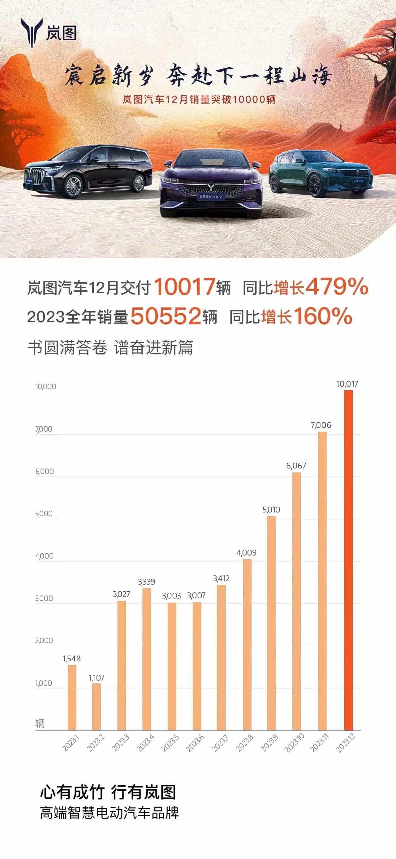 近日,岚图汽车公布了12月份交付状况,在刚刚过去的一个月中,岚图汽车共计交付新车10017辆,同比大增479%,这与前几天预测的情况相符,毕竟官方已经发布了 岚图梦想家(图片 | 参数 | 询价)一款车型12月的销售数字就突破了5000辆,按照岚图Free等的表现,最终销量破万也在情理之中。