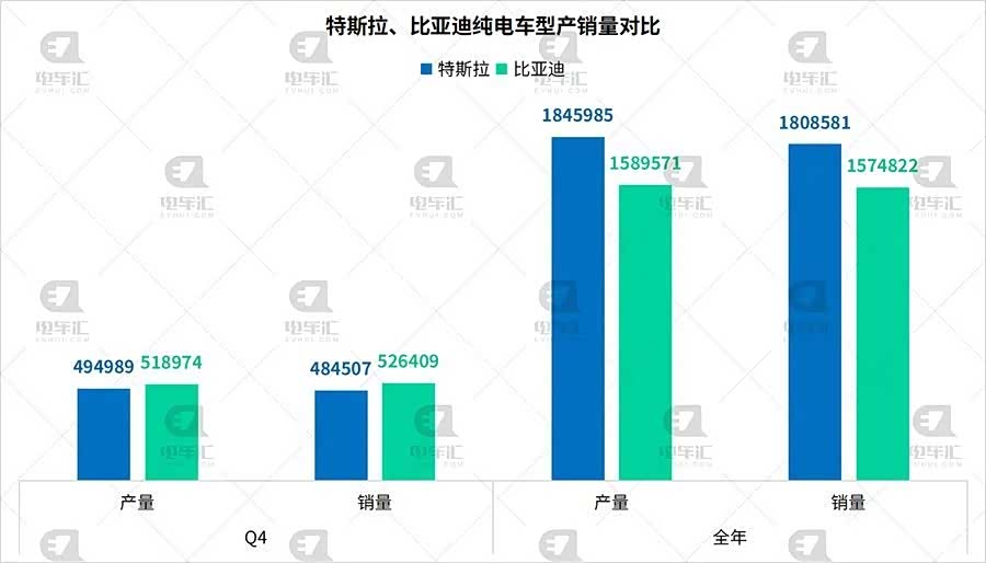 尽管单季度实现了超越,但在全年销量上,特斯拉仍然是全球纯电霸主。