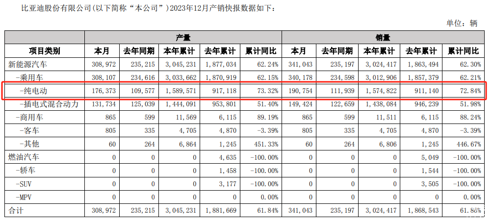 比亚迪纯电车型生产158.96万辆,销量157.48万辆;其新能源汽车累计销量达到了302万辆,同样也实现了全年300万辆的目标。