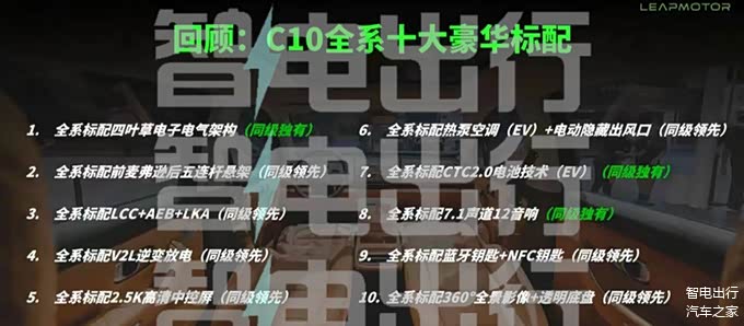 资料显示,零跑C10全系拥有十大豪华标配,包括:同级领先的前麦弗逊后五连杆悬架、LCC+AEB+LKA、V2L逆变放电、2.5K高清中控屏、热泵空调(EV)+电动隐藏出风口、蓝牙钥匙+NFC钥匙以及360°全系影像+透明底盘,还配备同级独有的四叶草电子电气架构、CTC2.0电池技术(EV)以及7.1声道12音响。