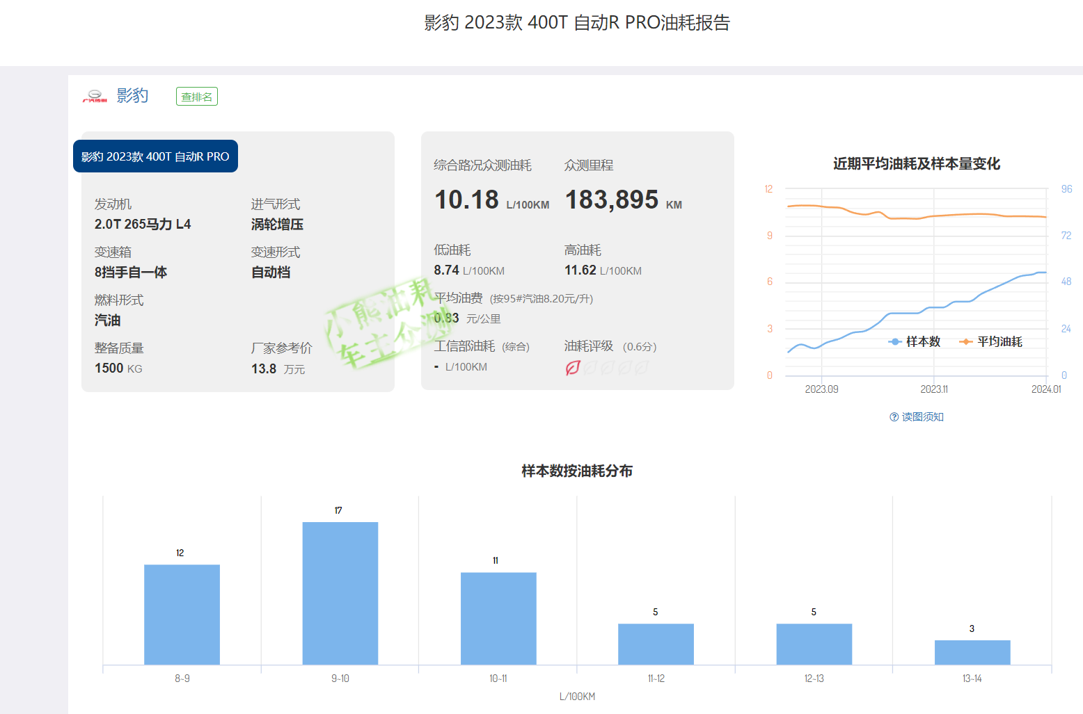 不过,这个预算的消费者肯定尤其关心油耗的表现,笔者这里截取了小熊油耗的第三方数据。可以看到400T 影豹R Pro版本的平均油耗是10.18L/100km,核算一下是每公里8毛钱的油费(按照95#汽油8.2元/升计算)。绝大多数车主都将油耗控制在了9-10升的范畴,这对于影豹R来说已经很不错了,毕竟隔壁03+的油耗也要10个多,但是差价可要贵出不少。