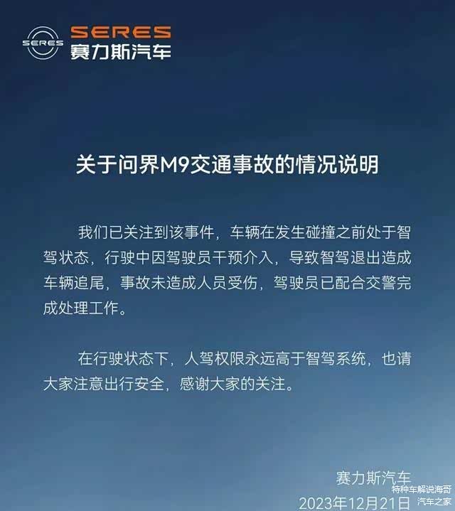 由于没有造成人员受伤,驾驶员已配合交警完成处理工作,不过有一个问题是,赛力斯对于驾驶员为何接管,没有做进一步的说明。