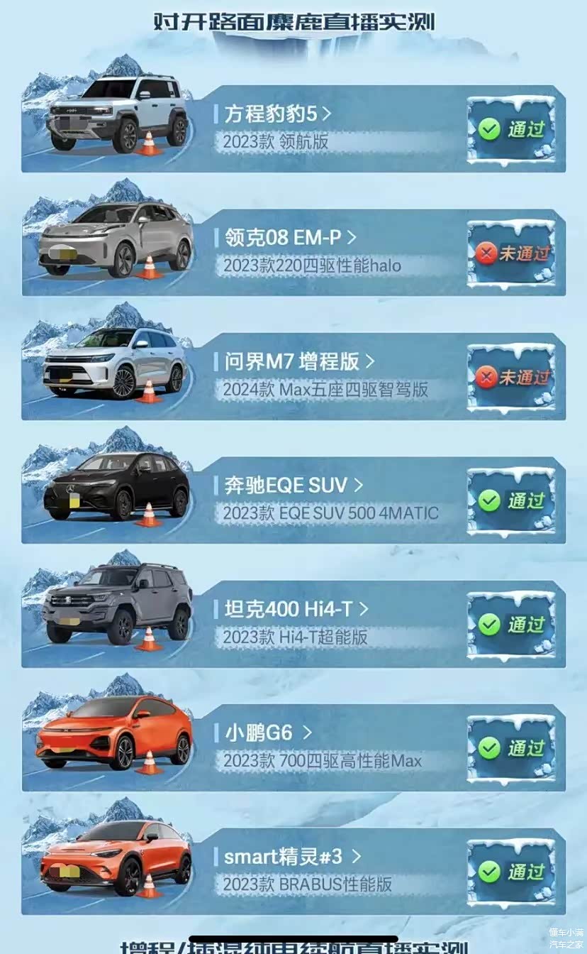 通过:方程豹豹5、奔驰EQE、坦克400Hi4-T、小鹏G6、smart精灵#3