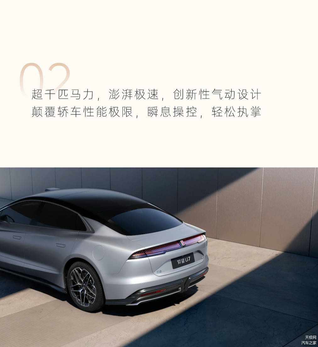 除了造型之外,仰望官方还透露了仰望U7的动力性能数据,称其拥有超千匹马力,将颠覆轿车性能极限。参考其两位老大哥U8和U9的动力系统,以及仰望U7自身的易四方徽标,其搭载四电机技术基本没跑。同样采用这套动力方案的U8,四电机最大功率可达880kW,最大扭矩为1280N·m,百公里加速甚至仅需3.6s。