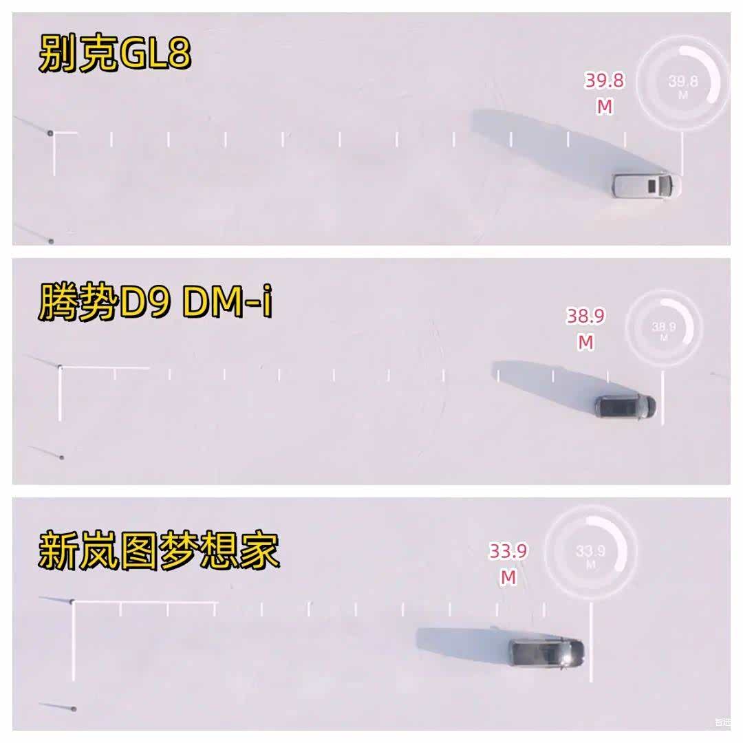 最终,通过P-Box读取的数据显示:别克GL8的制动距离为39.8m、腾势D9 DM-i为38.9m,新岚图梦想家为33.9m。