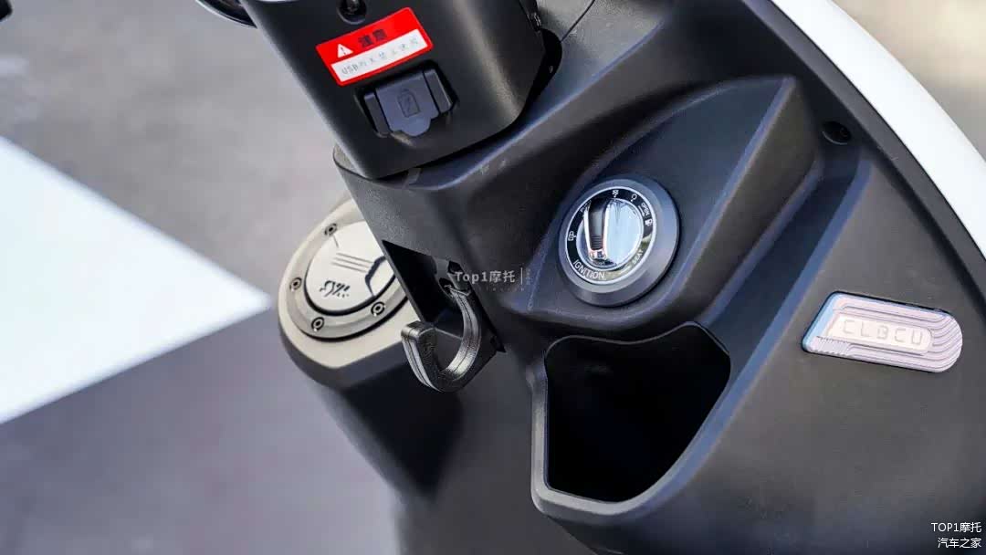 QC 3.0 USB充电接口,折叠式挂钩,高配车型还配备有无钥匙启动旋钮(可开启油箱/坐垫)/电门锁,开放式手套箱(可放进去700ml随身水杯),前置加油口,在车把下面依次排开,在手套箱的两侧,还有幻彩造型的CLBCU铭牌彰显身份。