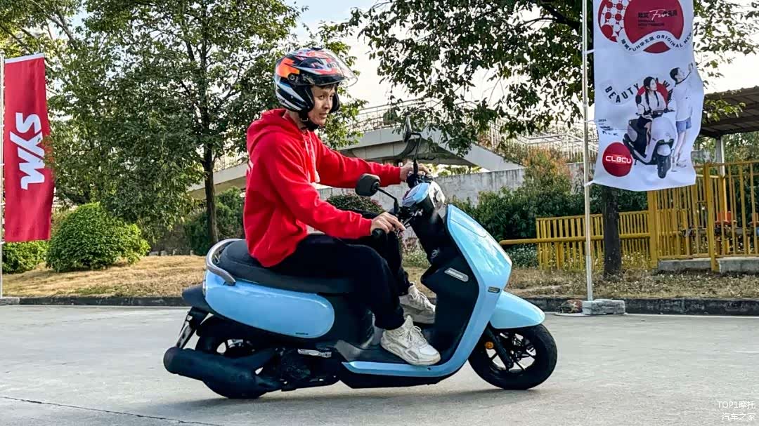 在实际的骑行体验当中,三阳CLBCU也尽显对女性用户的友好!小巧轻盈的车身,最大程度地为女性消费者提供了更充足的安全感。不过车虽小巧但并不局促,小编身高是173cm,骑上去之后的姿势如(图1)所示,为了更加舒适坐得比较靠后,腿部和脚部的空间非常富裕,当然女孩子骑着会更加协调一些(图2),后座的空间载人也是毫无压力。