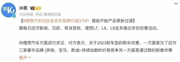 为了抢占销量先机,今年1月,理想汽车全系车型均推出优惠活动,不同车型版本降价 3.3-3.8 万元;理想 L7 和 L8 的 Max 车型还免费赠送 21 英寸轮圈,理想 L9 则全系赠送电动踏板,如果取消该轮圈和电动踏还可以再降 5000 元。