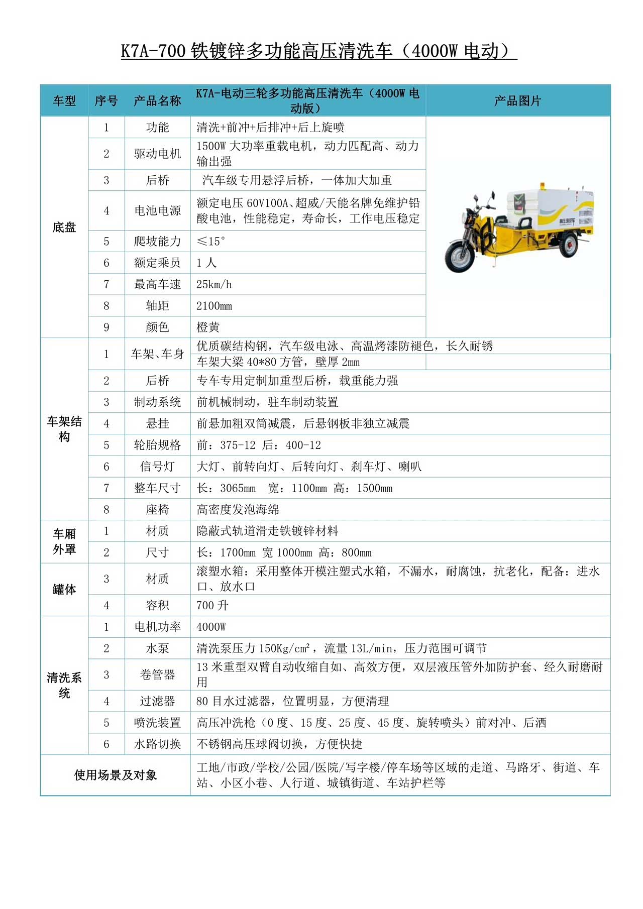 K7A-700铁镀锌多功能高压清洗车(4000W电动)电动路面高压清洗车