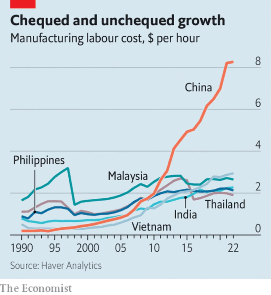根据英国《经济学人》的最新报道,中国制造业人工成本已经增长到8美元/小时,泰国、越南、印度、墨西哥等地普遍在2-3美元。