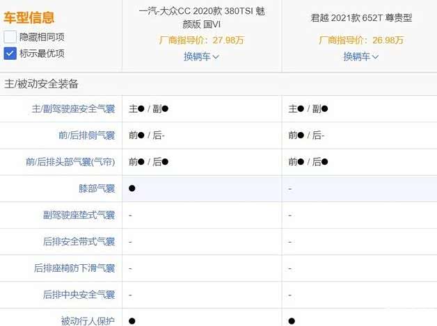 在安全气囊的数量方面,这个级别的车型基本上都标配主副驾驶座安全气囊,前排侧气囊和前后排头部气囊。大众CC另外有膝部气囊。而且我们选择的两款车型都有被动行人保护装置,配置还算不错。