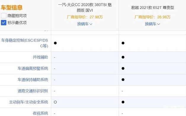 但是在主动性安全配置方面,大众CC明显要差很多,只有疲劳驾驶提示一项功能,想要更多配置都需要买顶配。别克君越配置的就比较丰富,有并线辅助,车道偏离预警,车道保持和主动刹车。